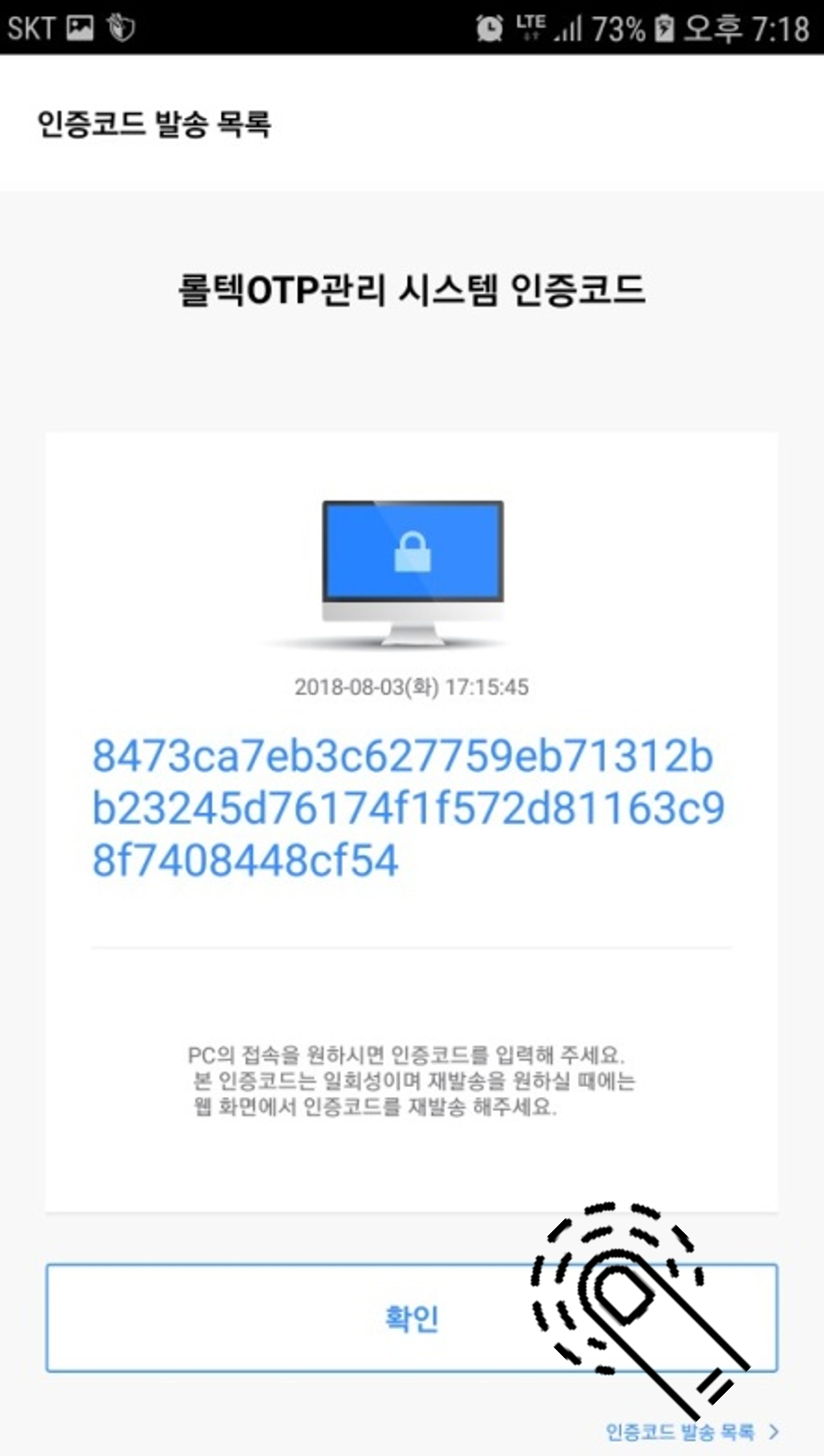 Àü´Þ ¹ÞÀº ÀÏȸ¿ë ÀÎÁõÄڵ带 ¡°È®Àιöư¡± Çѹø Ŭ¸¯À¸·Î OTP ÀÎÁõÄÚµå ÀԷ¾øÀÌ ·Î±×ÀÎ Á¦°øÇÕ´Ï´Ù.